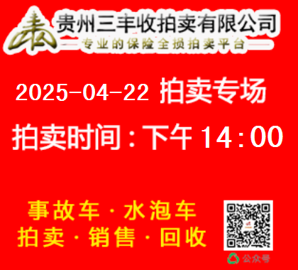 貴州三豐收拍賣(mài)有限公司網(wǎng)絡(luò)拍賣(mài)于2025年04月29日下午14點(diǎn)00準(zhǔn)時(shí)開(kāi)拍 請(qǐng)需要拍賣(mài)車(chē)輛的會(huì)員 通過(guò)二維碼繳納拍賣(mài)保證金或者致電我司繳納保證金 0851-86711666 18275321810 13378515056 18268322089 人工審核